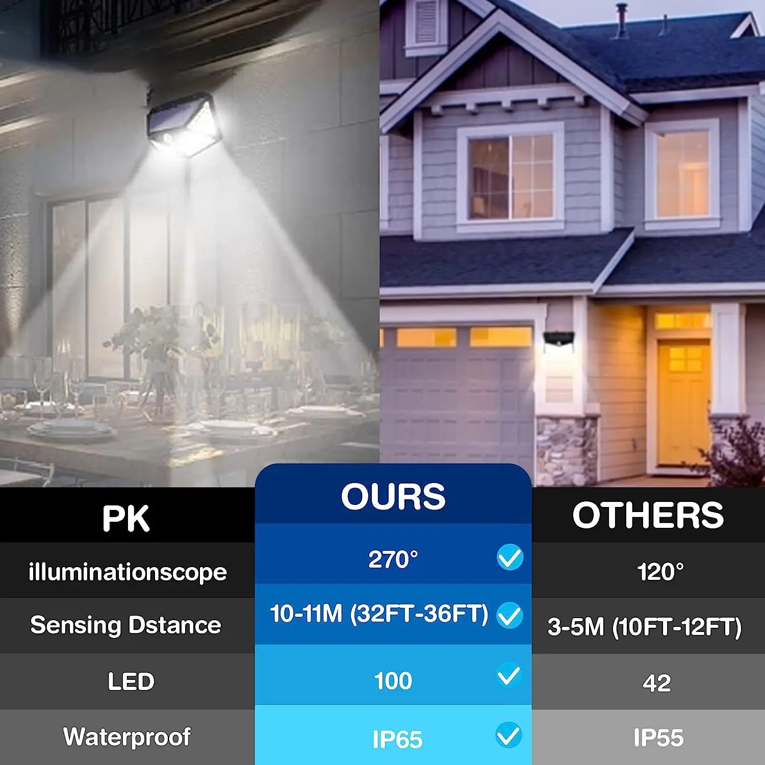 1.【More Brightness with 100 LEDs 】Our outdoor solar motion sensor lights with 100 LED sources that provide a brighter, This motion sensor safety light is designed to provide lighting for your exterior walls, front doors, courtyards, garages, decks, gardens, and more.