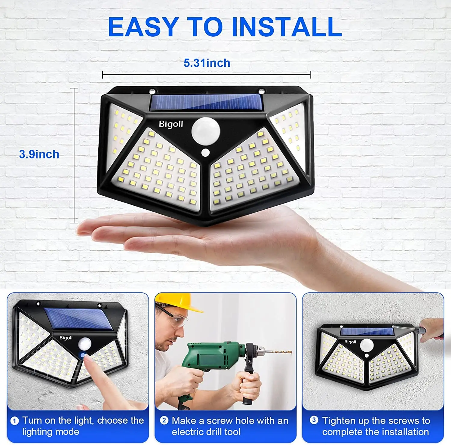 4.【Waterproof IP65 and Heatproof】The 100 led Solar Motion Sensor Light is great for wall, patio, garden, porch, lawn, pathway, Driveway , gutter, etc.. It's specifically designed to withstand extreme weather conditions.