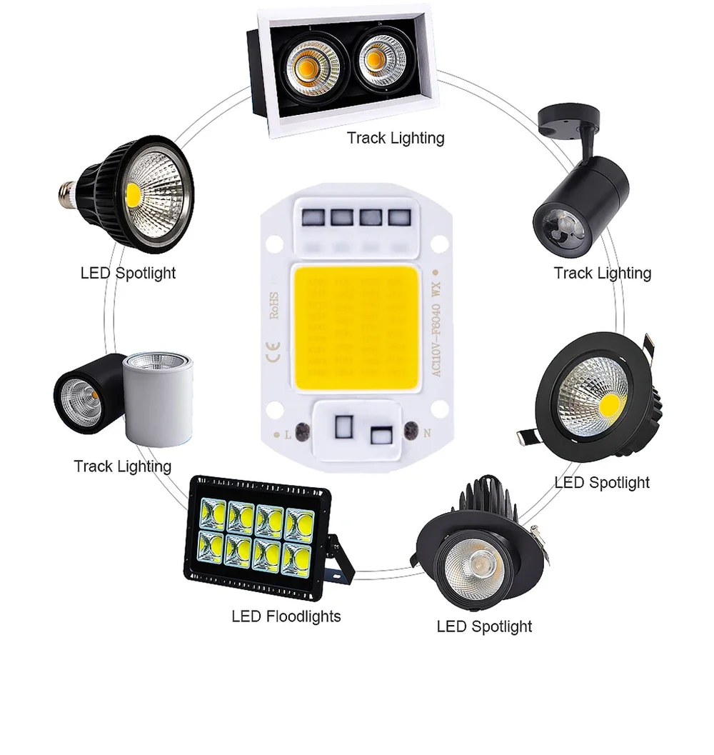Item: LED COB Smart Chip Watt: 20W 30W 50W Volt: AC 110V / 220V Color Temperature: Cold White 6000-6500K;Warm White 2800-3200K Color Rendering Index:Ra90 Beam Angle :120 degree Feature: No Need Driver;;Smart IC;;Easy to DIY How to use it: Connect 220-240V Lifespan:over 10,000hrs Housing material:Aluminum