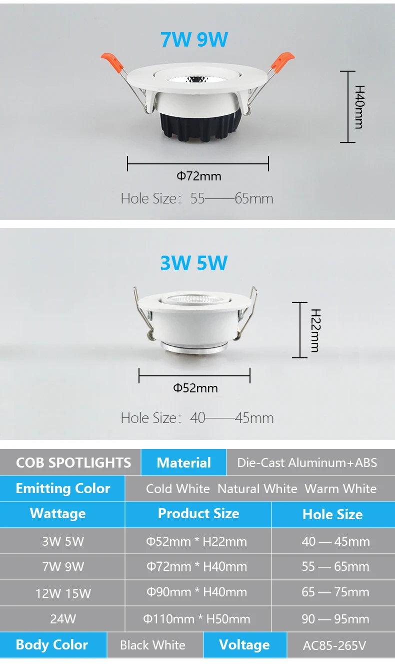 Input Voltage:AC85-265V/110V/220V 50/60Hz Power:3W/5W/7W/9W/12W/15W/18W/24W Dimmable:Yes / Non dimmable Color Rendering Index(CRI):>Ra85 Beam Angle:60° LED CHIP:C0B Chip(Epistar) Luminous Flux:85~90lm/W Temperatures:-25 to 45° Level of Protection:IP52 Color Temperature:Warm White:(2700K-3000K); Natural White:(4000K-4200K);Cold White:(6000K-6500K) Life:50000~80000 Hours Material:Die casting Aluminum +Lens