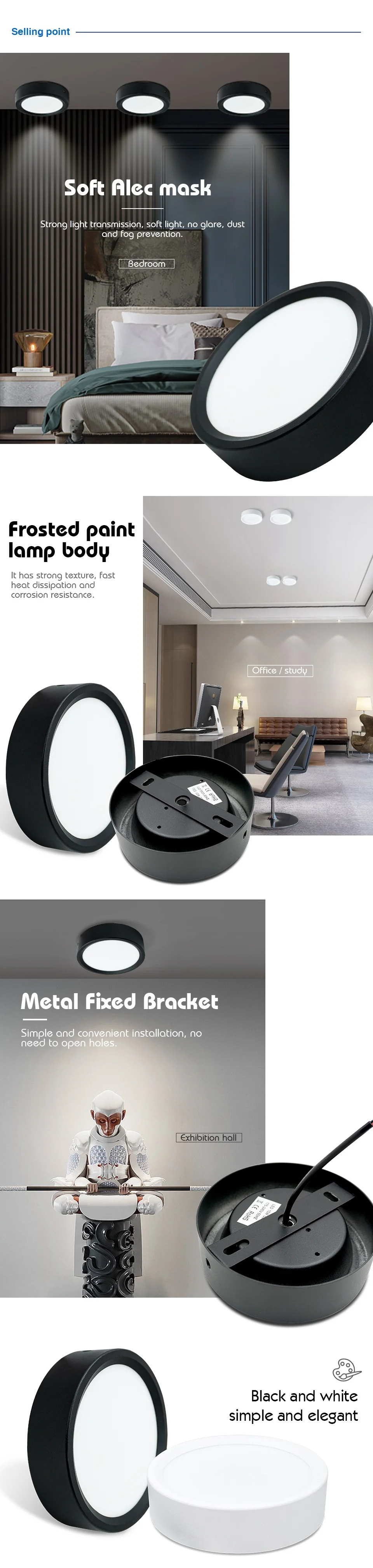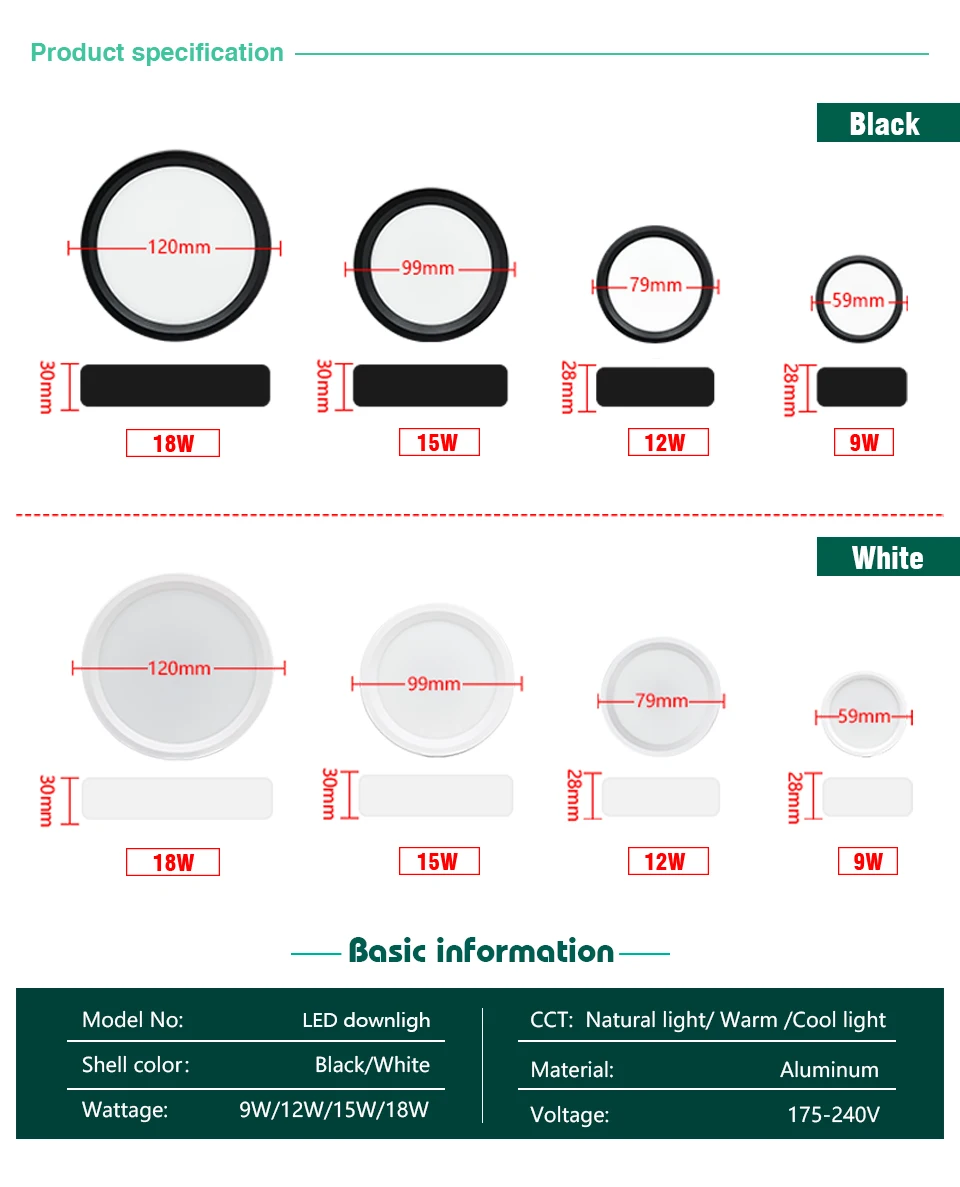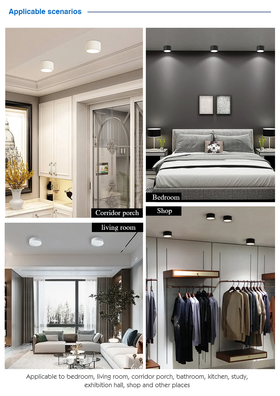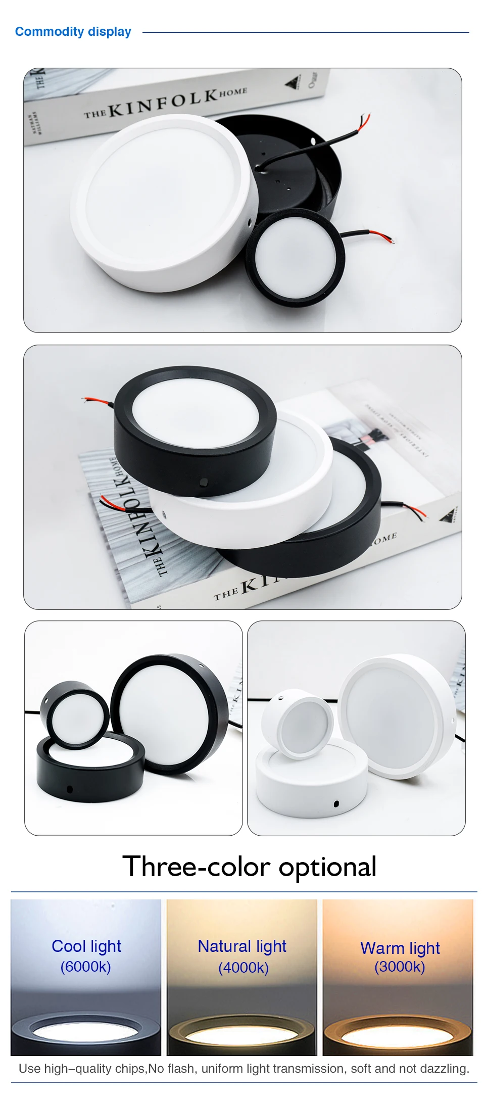 Product Features: 1. Wide range of applications. The downlight can meet various needs of bedrooms, living rooms, kitchen islands, corridors, cloakrooms, doorways, basements and other spaces, and fit your roof and ceiling perfectly. 2. Made of constructed from die cast aluminium alloy. With simple and elegant modern design, surface mount downlight, no to drill holes in the ceiling, simple and easy to install. 3. Compact low profile design is discreet and attractive, simple and stylish, very easy to install, no decrease in the floor height, providing more space and No damage to the ceiling. 4. Different size and light color for your option. There are 9W/12W/15W/18W light for your option, with white shell and black. Suits all kinds of spaces.