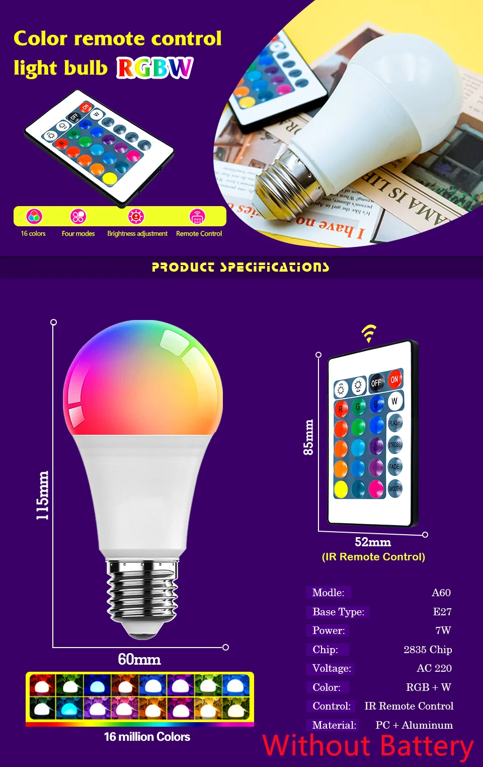 LED RGB Light Bulb AC 220V 230V E27 Bombillas LED 7W IR Remote Control Changeable Colorful RGBW Led Lamp Spotlight Bulb